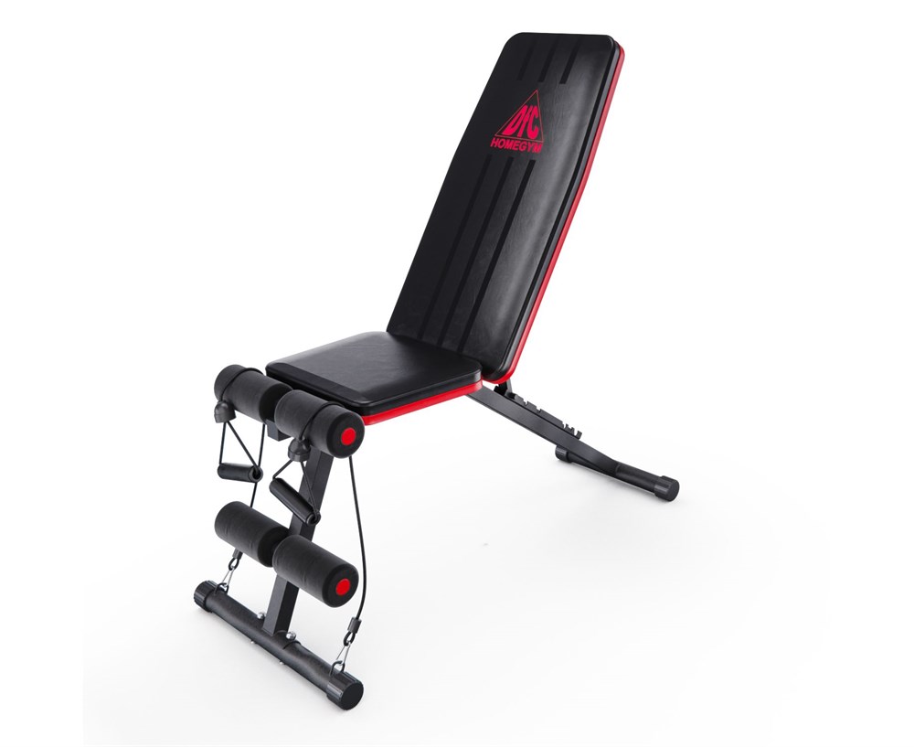 Универсальная скамья DFC DCH310 предназначена для домашних тренировок на различные группы мышц: во время занятий можно использовать собственный вес и дополнительные отягощения, гантели. Имеет стильный дизайн: обивка и каркас чёрного цвета, с яркими красными декоративными элементами.