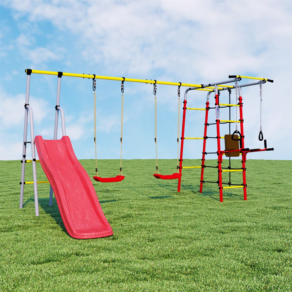 В дачном спортивном комплексе ROMANA «Богатырь Плюс» предусмотрено много возможностей для спортивных занятий маленьких богатырей. Здесь и лестница, и турник, и брусья, и гимнастические кольца, а также небольшой канатный лаз из шнура повышенной прочности. Вторая часть комплекса — это удобная и безопасная горка. Части соединены надежной металлической перекладиной, которая испытывается нагрузкой в 200 кг.