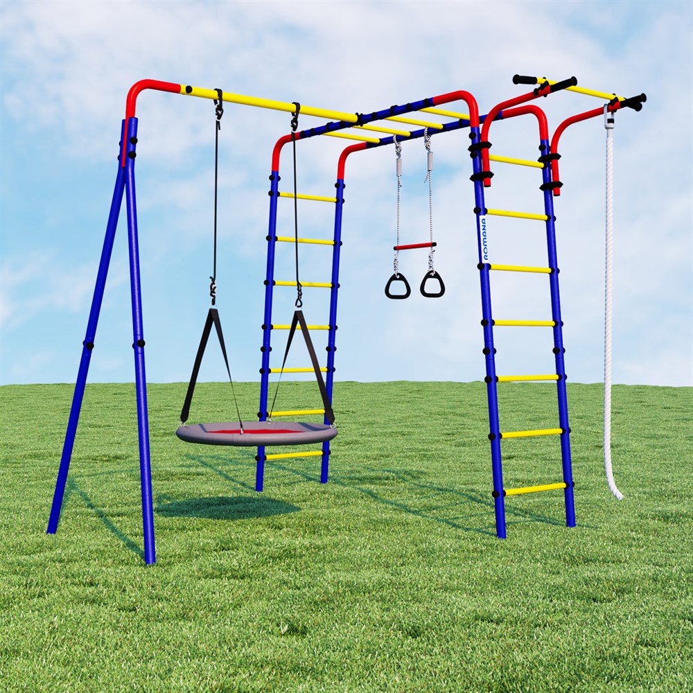 Уличный спортивный комплекс «Веселая Лужайка-2». В комплекте: турник подвижный, рукоход, канат, кольца гимнастические, качели. Выдерживает нагрузку до 100 кг. В сложенном состояние размешается в двух упаковках. Легко монтируется и демонтируется
