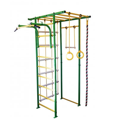 Комплектация: турник – брусья ( внутренняя ширина 410 мм.; внешняя-495 мм.; одевается на трубу диаметром 25 мм. ), кольца гимнастические, трапеция, шторм- трап, канат.