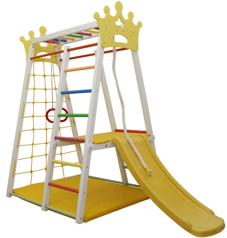 Комплектация ДСКрукоход, шведская стенка наклонная, сетка для лазанья, площадка, канат, кольца, мат, горка ЛДСП