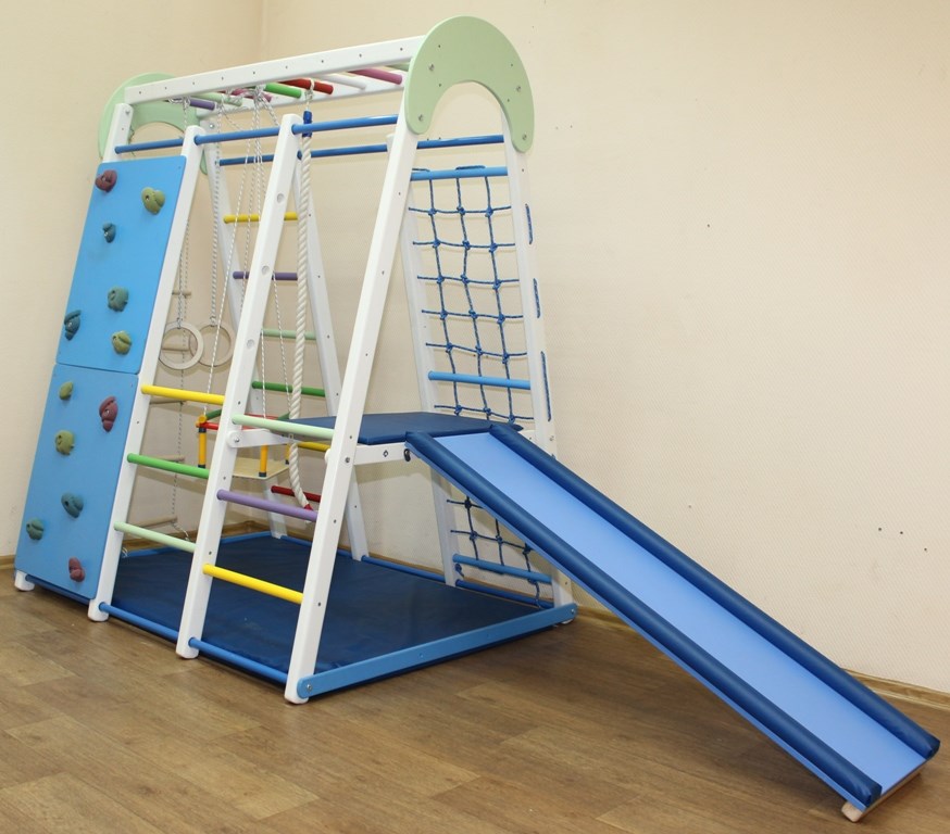 Комплектация ДСКскалодром, качели, канат, кольца, горка, мат, лесенка веревочная, шнур для вязания гладиаторской сетки