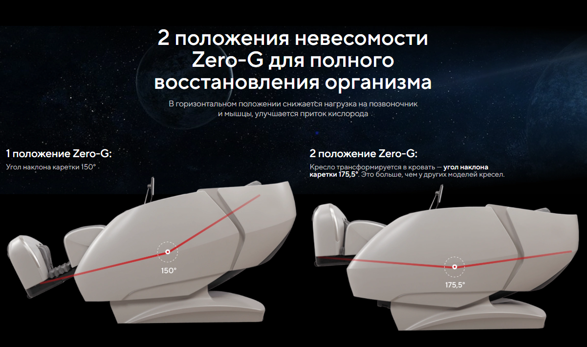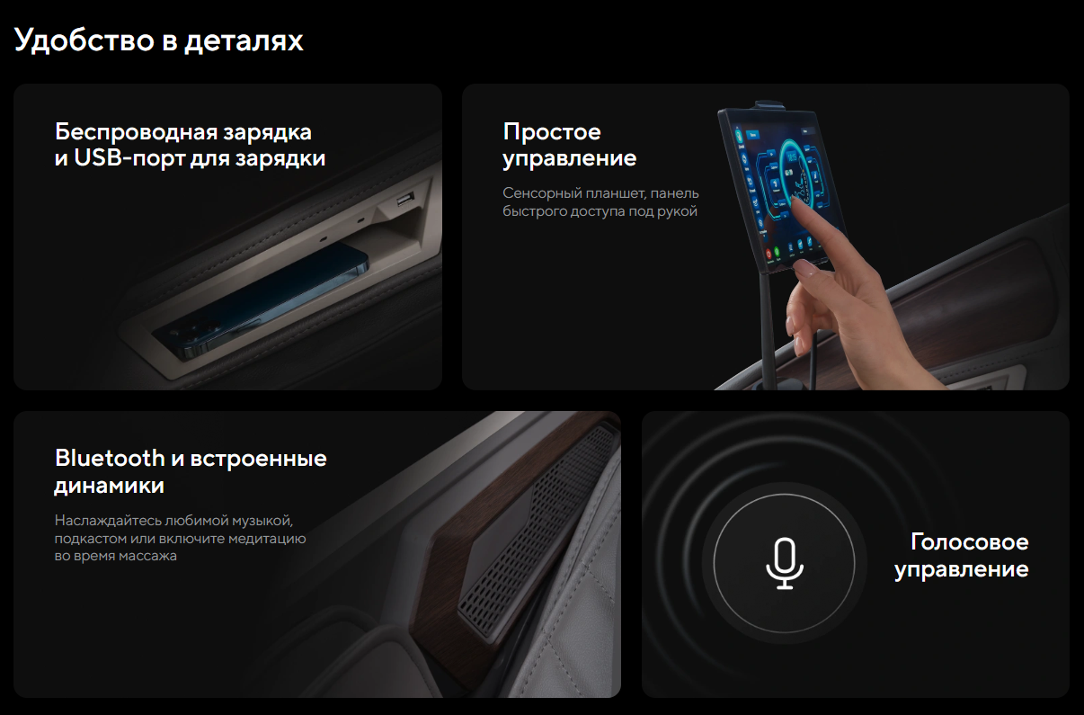 Функционал | Голосовое управление, Растяжка спины, Функция невесомости (Zero G), Биосенсор для индивидуального массажа, Прослушивание музыки через Bluetooth, Запоминание программ, Панель быстрого доступа, Беспроводная зарядка для телефона, USB-зарядка для телефона |