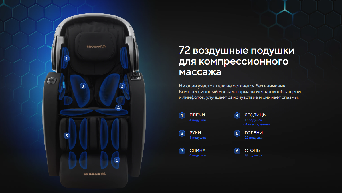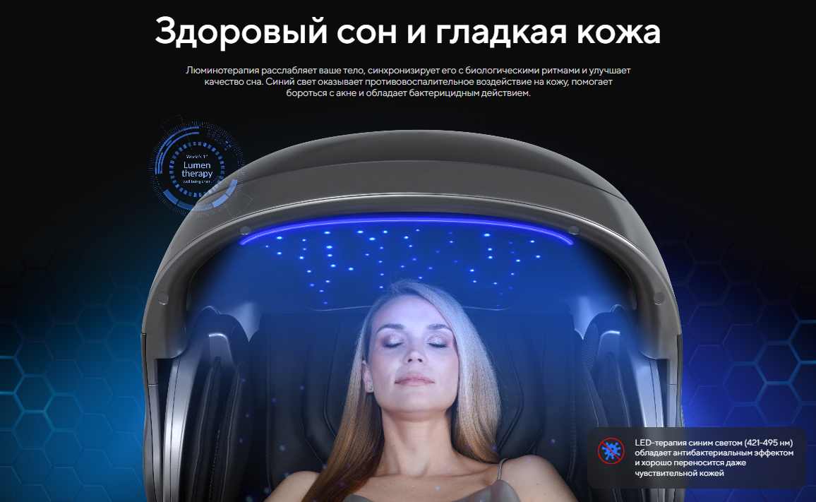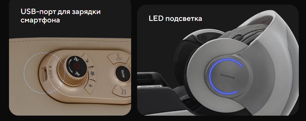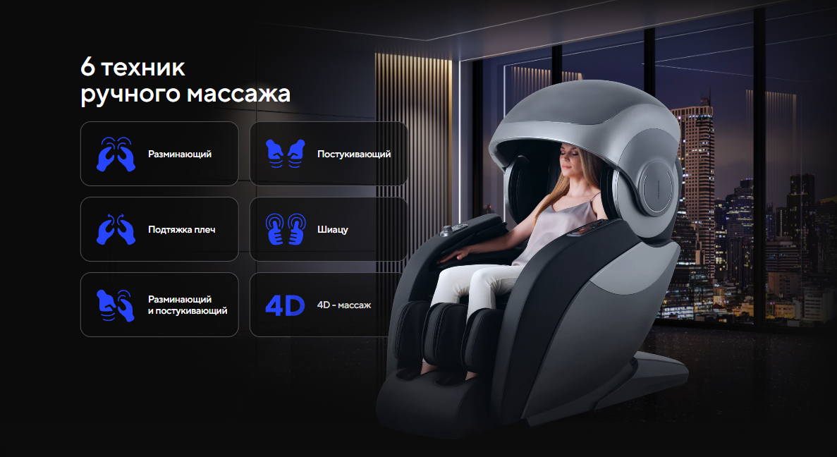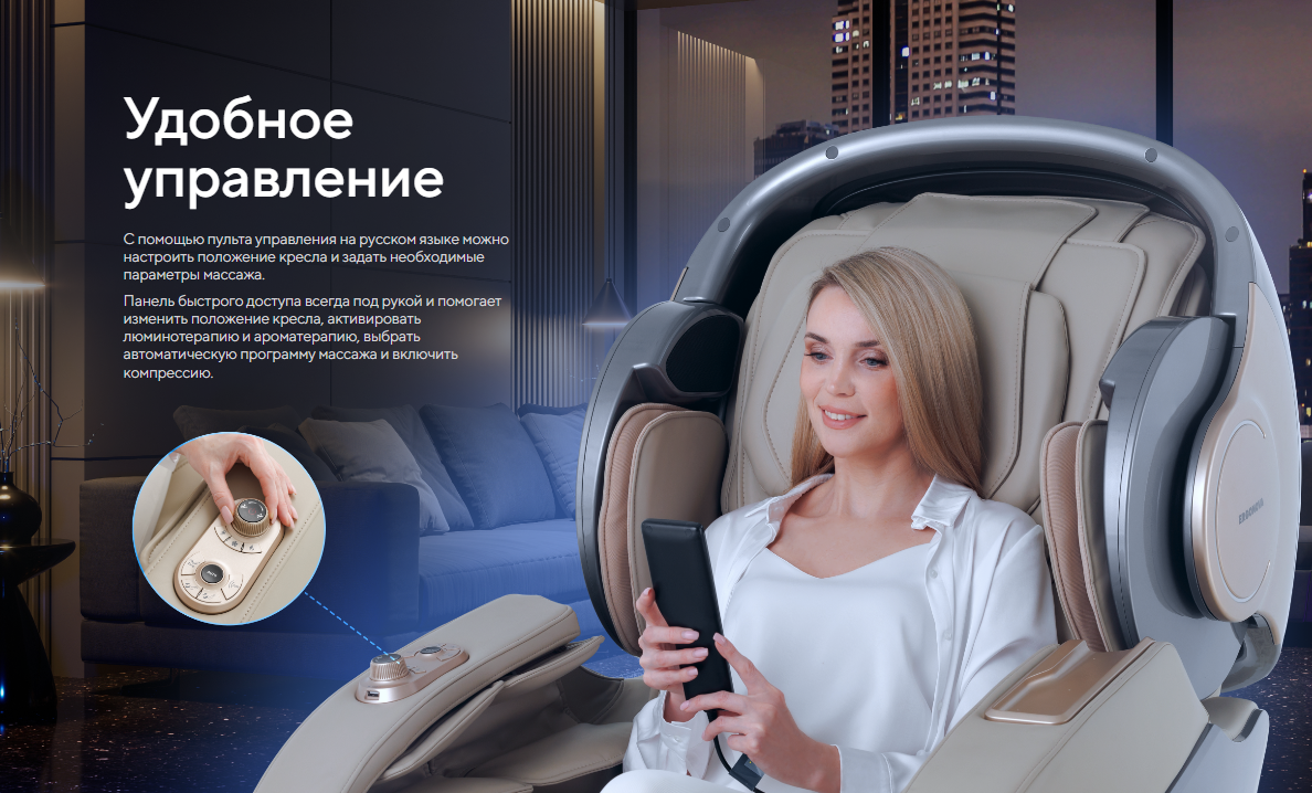 Функционал | Голосовое управление, Растяжка спины, Функция невесомости (Zero G), Люминотерапия, Ароматерапия, Прослушивание музыки через Bluetooth, Панель быстрого доступа, USB-зарядка для телефона |