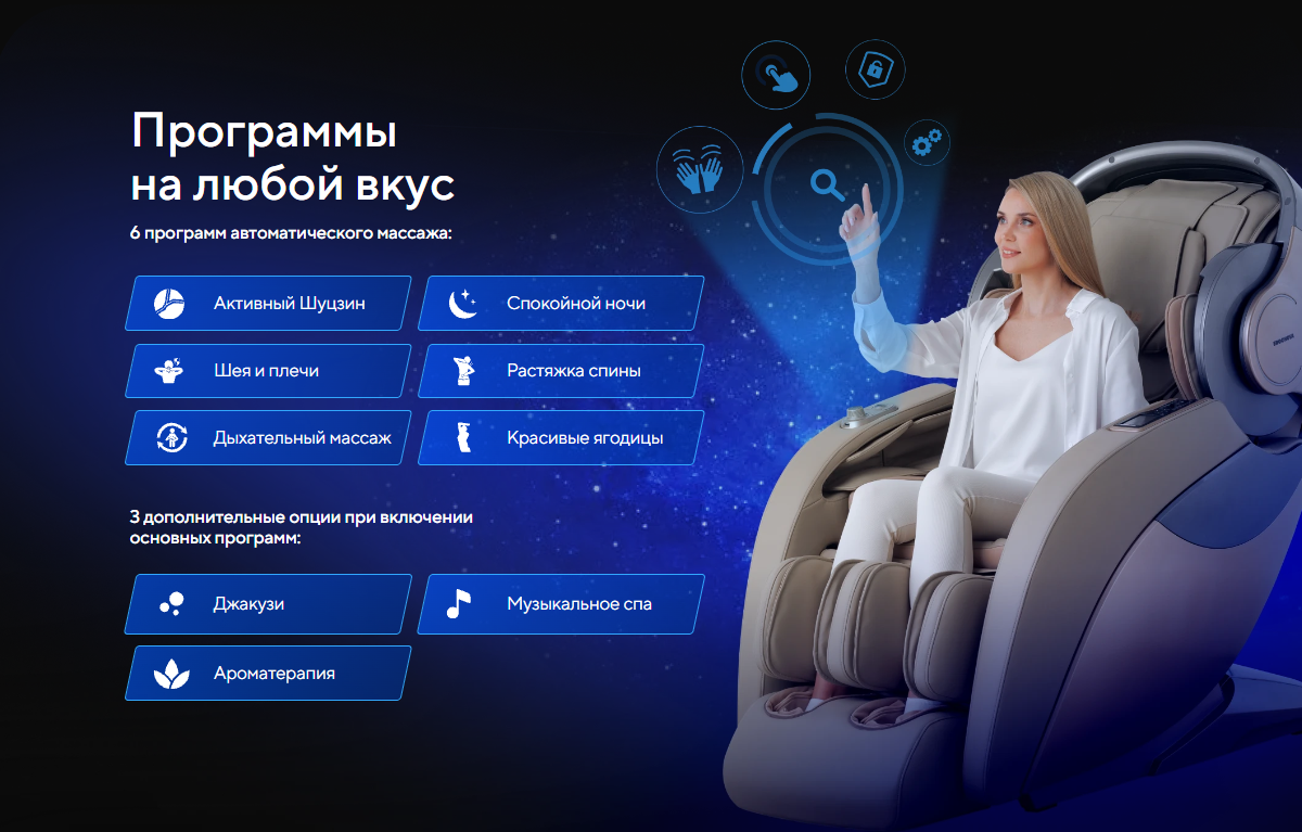 Автоматические программы | Активный шуцзин, Cпокойной ночи, Шея и плечи, Растяжка спины, Дыхательный массаж, Красивые ягодицы |