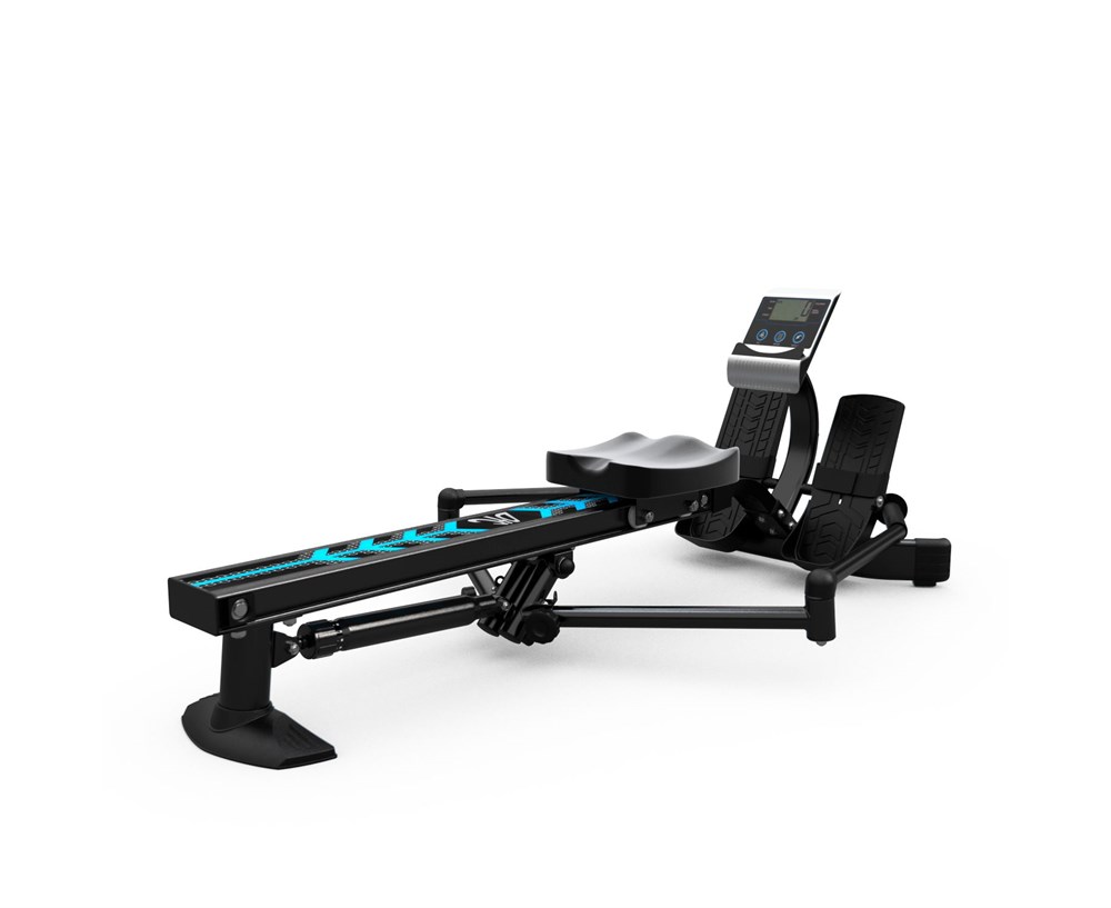 Нагрузка тренажёра создаётся при помощи 1-го гидравлического цилиндра и регулируется с помощью колесика в верхней части каждого цилиндра. Доступно 12 уровней сопротивления, рекомендовано начинать занятия с минимального значения. Дисплей 8 х 4 см работает от 2-х батареек типа ААА (не входят в комплект) и отображает следующие параметры: время, количество гребков общее, количество гребков за 1 тренировку и калории. На консоли расположена подставка под планшет.