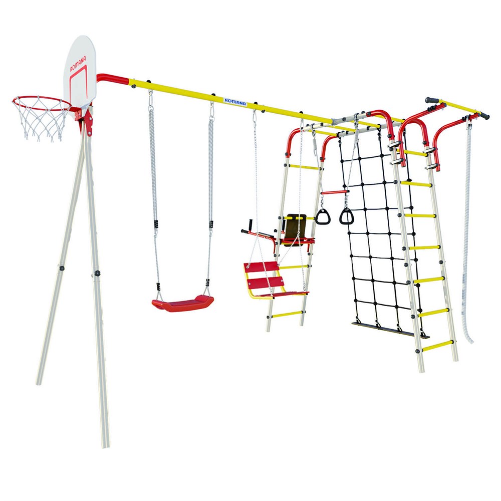 КОМПЛЕКТ ROMANA Акробат - 2 NEW + Качели пластиковые + Сетка лаза на грунтозацепах + Качели цепные + Брусья со спинкой + Доп.ступень (с крепежом)