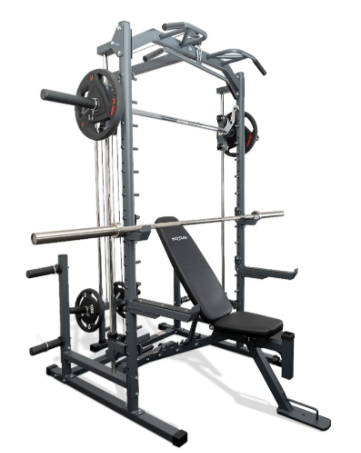В станции есть тяга верхнего и нижнего блоков. Также машина Смита. Штанга Смита легко скользит по 8 роликам, приводимым в движение встроенными подшипниками, что создает ощущения тренировки со свободным весом.