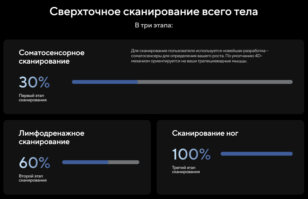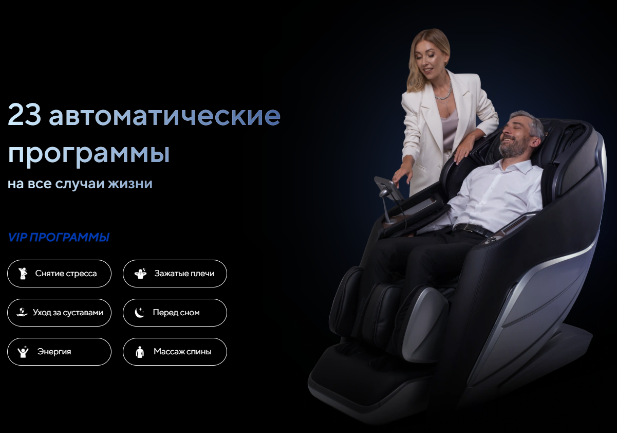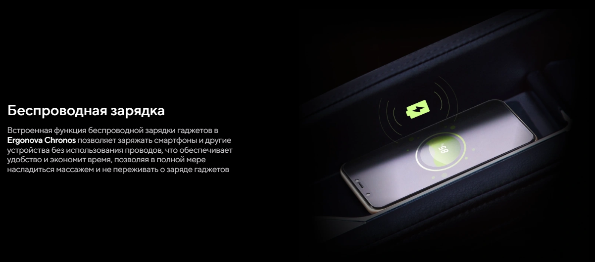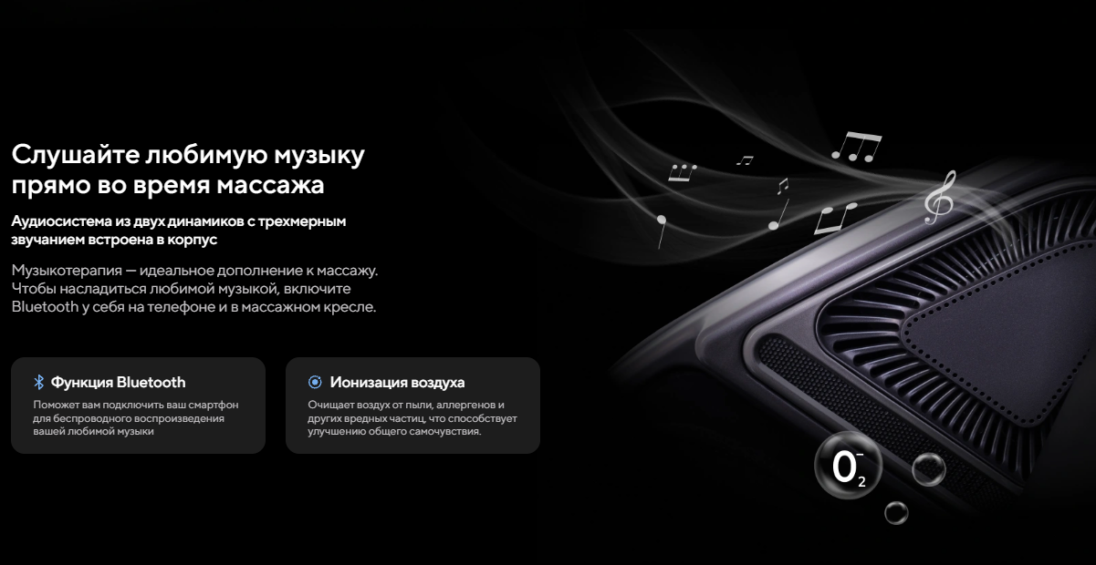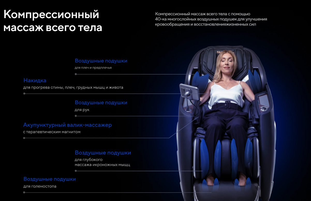 | Функционал | Голосовое управление, Растяжка спины, Функция невесомости (Zero G), Прослушивание музыки через Bluetooth, Запоминание программ, Панель быстрого доступа, Беспроводная зарядка для телефона |