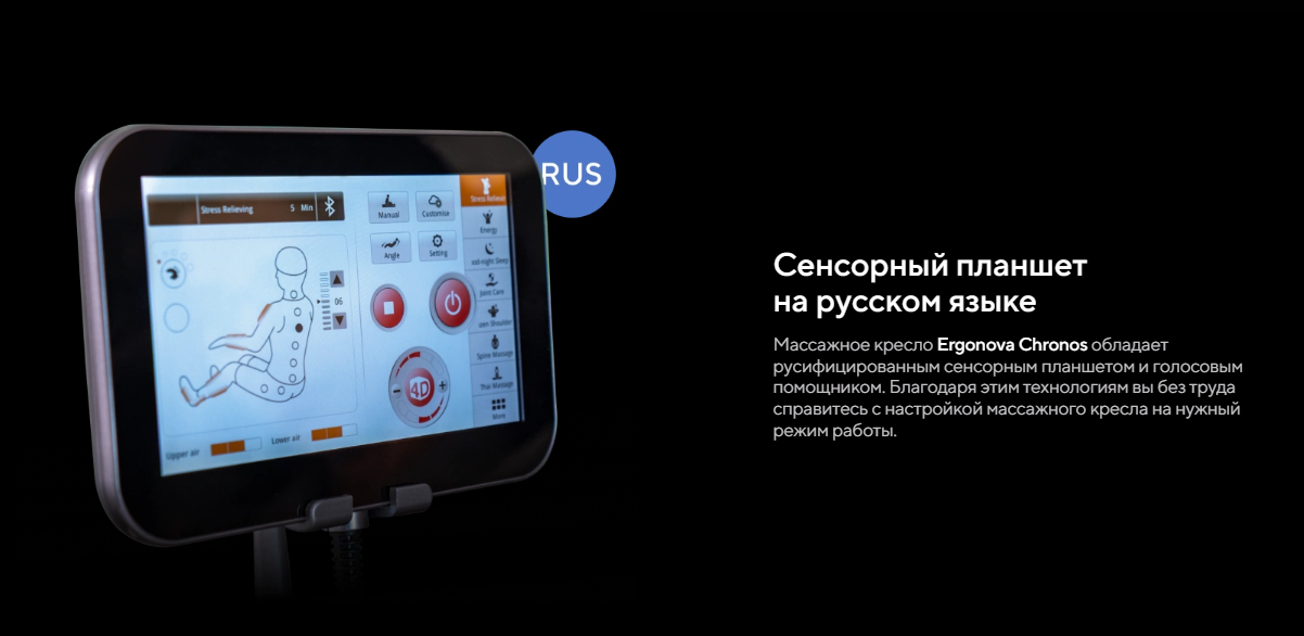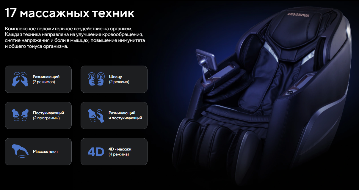 Ergonova Chronos создан для тех, кто любит глубокий качественный массаж и не готов идти на компромиссы. Впечатляюще широкий набор массажных техник, флагманский 4D-массаж, уникальные автопрограммыи премиальные материалы.