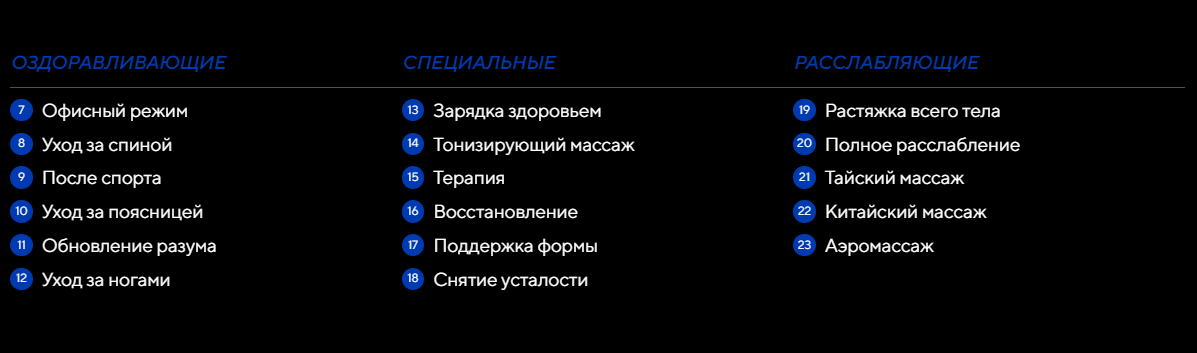 | Автоматические программы | 6 vip-программ, 6 офисных, 6 специальных, 5 расслабляющих |