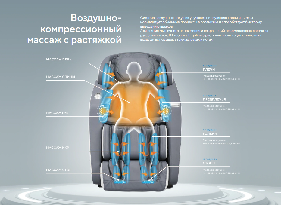 Подушки совершают разминающие и сжимающие движения вверх и вниз. Лимфодренажный массаж играет огромную роль в расслаблении мышц икр и уменьшении отеков.