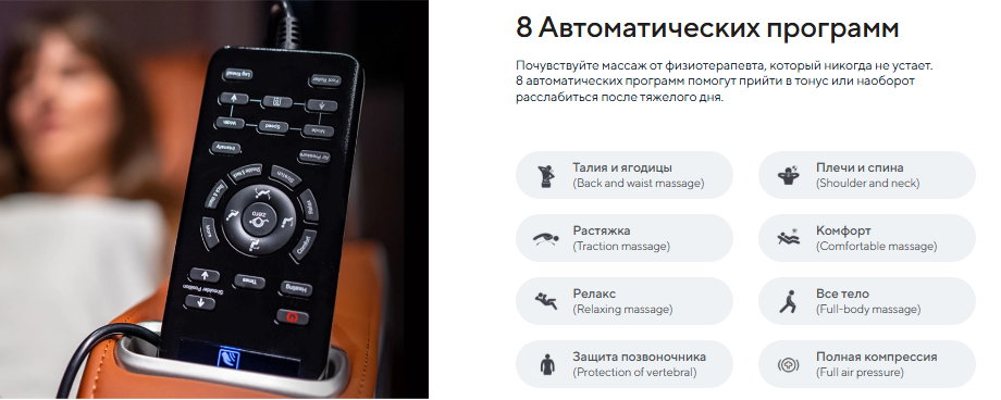 Автоматические программы | Комфорт, Расслабление, Растяжение, Массаж плеч и шеи, Массаж спины и поясницы, Массаж всего тела, Мануальный массаж, Воздушно-компрессионный массаж всего тела |