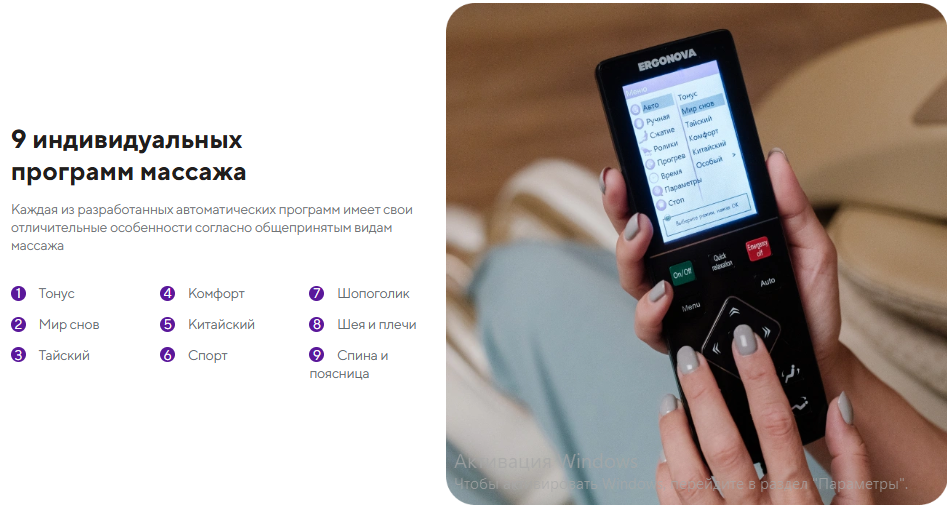 Автоматические программы | Тонус, Мир снов, Тайский, Комфорт, Китайский, Спорт, Шопоголик, Шея и плечи, Спина и поясница |