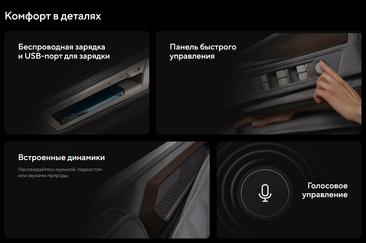 Функционал | Голосовое управление, Растяжка спины, Функция невесомости (Zero G), Биосенсор для индивидуального массажа, Прослушивание музыки через Bluetooth, Запоминание программ, Панель быстрого доступа, Беспроводная зарядка для телефона, USB-зарядка для телефона |