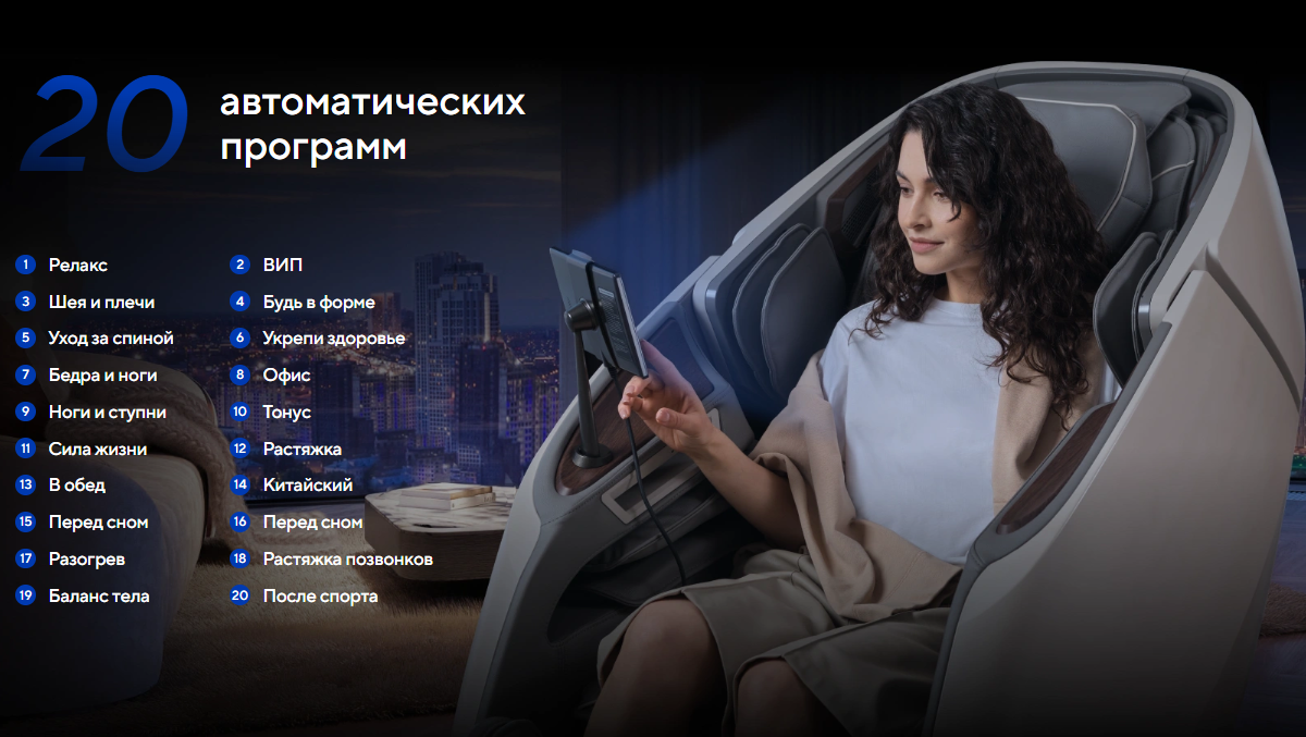 Автоматические программы | Релакс, Шея и плечи, Уход за спиной, Бедра и ноги, Ноги и ступни, Сила жизни, В обед, Перед сном, Разогрев, Баланс тела, Вип, Будь в форме, Укрепи здоровье, Офис, Тонус, Растяжка, Китайский, Растяжка Тай, Растяжка позвонков, После спорта |