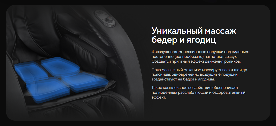 Первое в мире кресло с люмино- и аромотерапией, а также потрясающим массажем ягодиц. Создано для женщин, но порадует всех.
