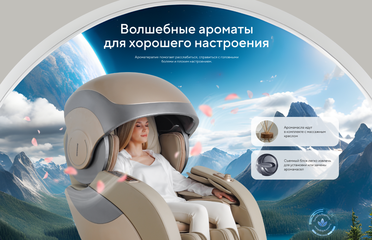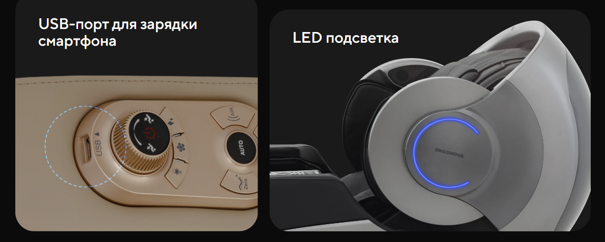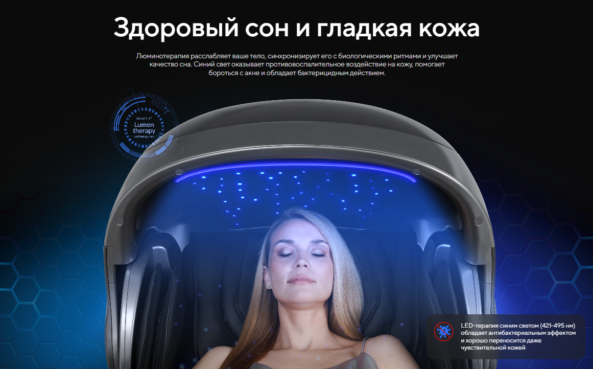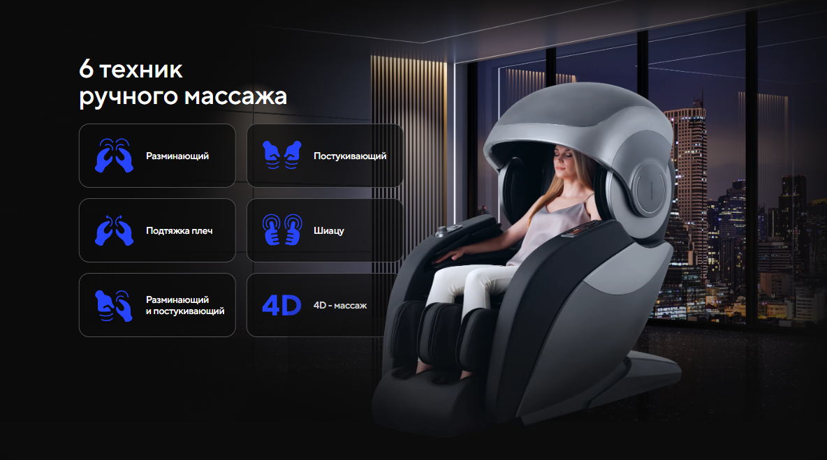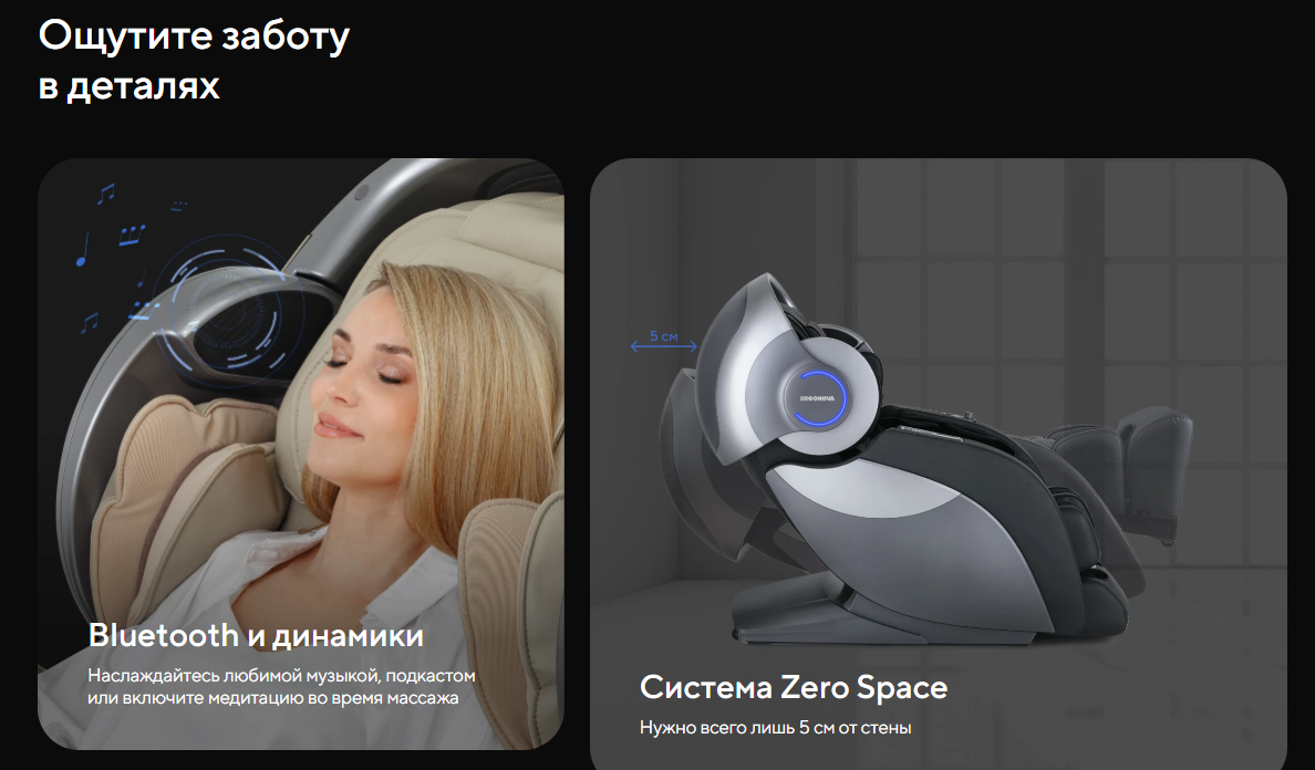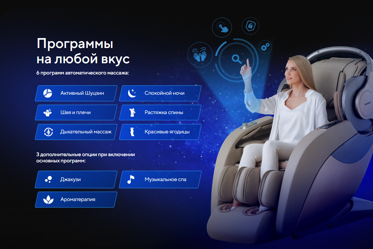 Функционал | Голосовое управление, Растяжка спины, Функция невесомости (Zero G), Люминотерапия, Ароматерапия, Прослушивание музыки через Bluetooth, Панель быстрого доступа, USB-зарядка для телефона |