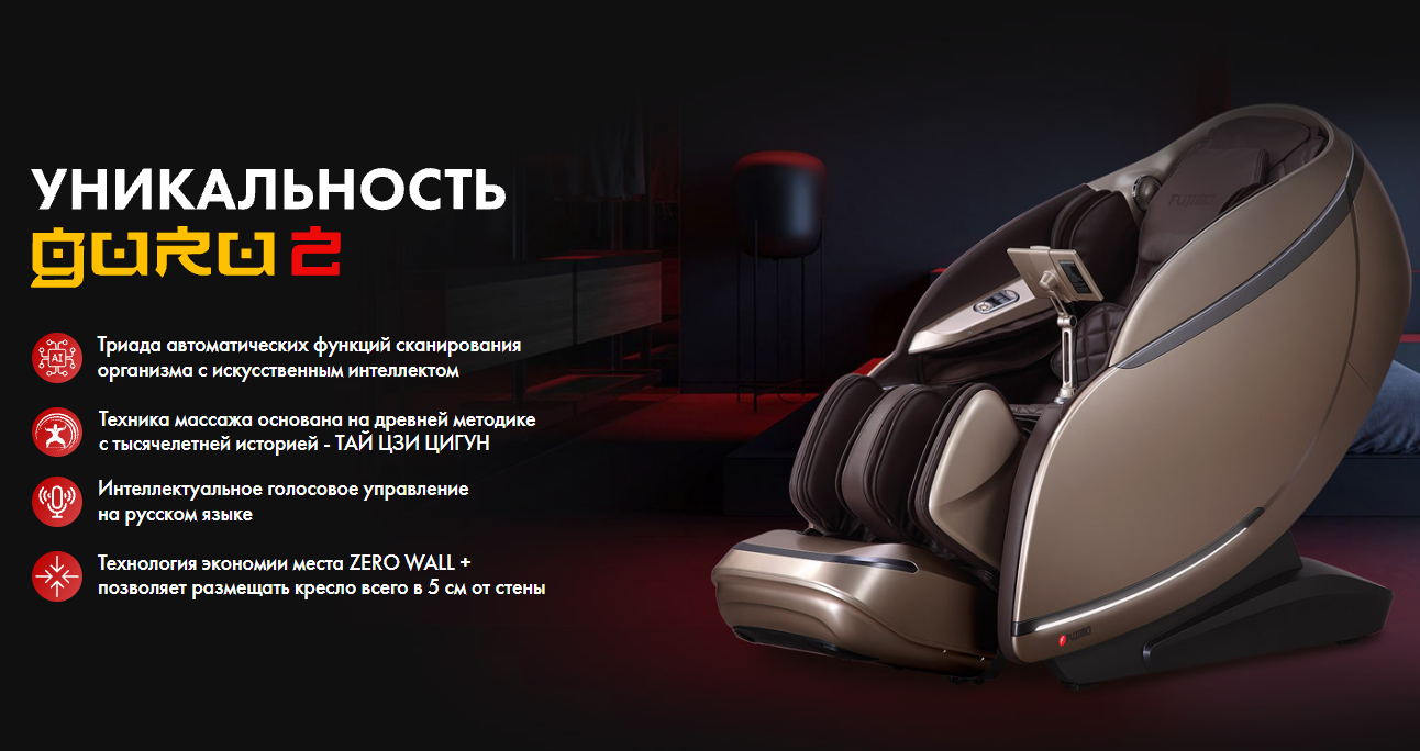* Примечание: Кресло FUJIMO 氣 GURU2 имеет ограниченный список голосовых команд, который указан в инструкции по использованию. Данные команды необходимо произносить четким и разборчивым голосом вблизи микрофона кресла. Изменение фразы на идентичную по смыслу не может активировать массажное кресло и команду необходимо произнести заново в правильной последовательности слов. Распознавание голосовых команд кресла FUJIMO 氣 GURU2 настроено на стандартный русский диалект и для определённого круга пользователей эта функция может полностью не работать. Производитель и поставщик данного массажного кресла снимает с себя ответственность за невозможность управления кресла голосом в таких случаях, в рамках выполнения своих гарантийных обязательств и возможного морального ущерба, который пользователь может получить не имея возможности управлять креслом с помощью голосовых команд. В таких случаях, компания FUJIMО рекомендует использовать пульт управления с удобным русифицированным интерфейсом.