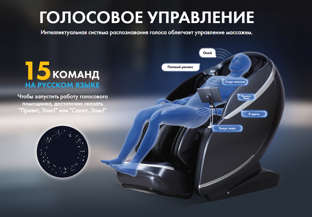 - Голосовой контроль на русском языке* облегчает управление массажем