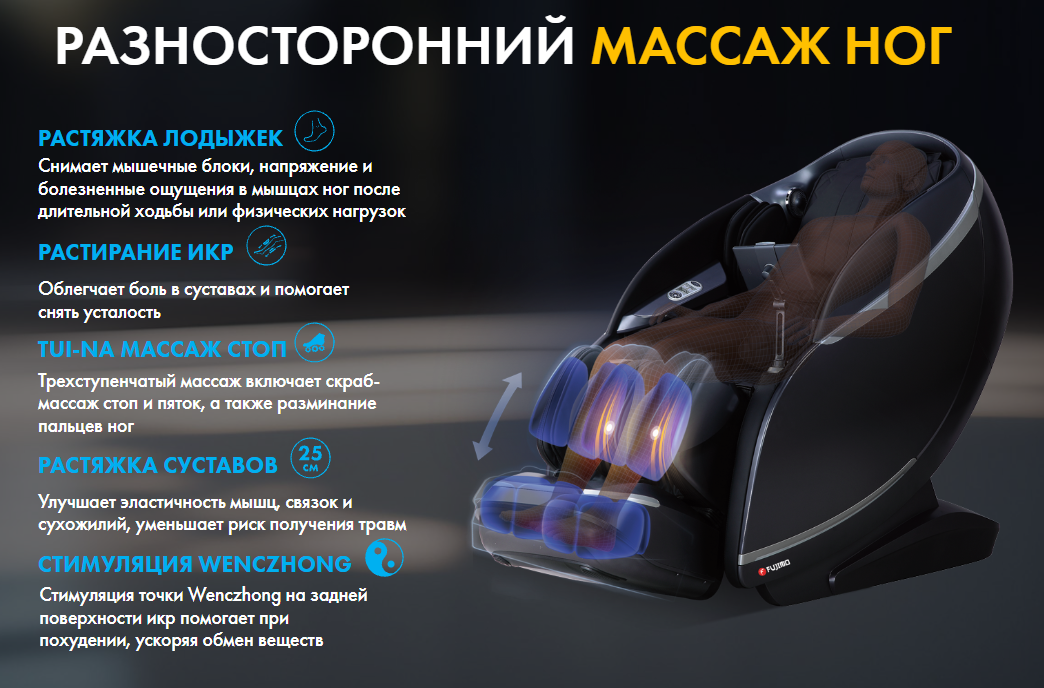 | Вид массажа стоп | TUI-NA / Акупунктурный / Воздушно-компрессионный / Роликовый / Шиацу |