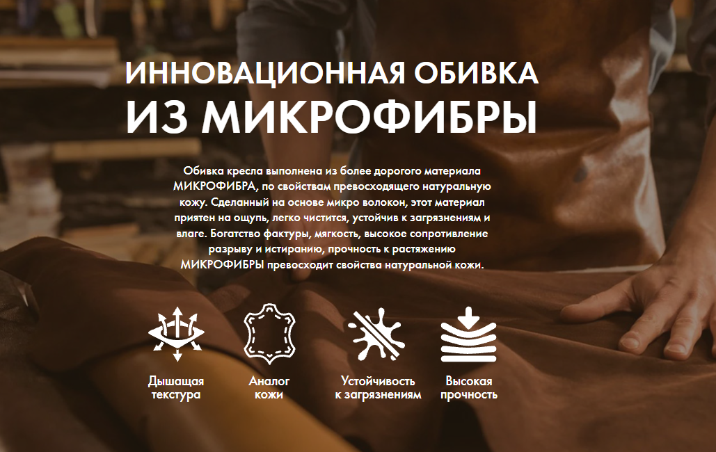 - Новый материал обивки из микрофибры по свойствам и качеству превосходит натуральную кожу