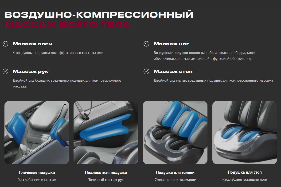 - В кресле установлено 19 воздушных подушек, которые расположены в области плеч, рук, бедер, икр и стоп. Интенсивность давления в подушках можно регулировать
