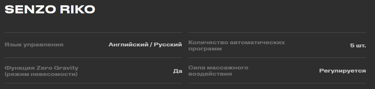 | Функции регулировки | Контроль интенсивности воздушного массажа / Контроль скорости / Регулировка длины блока для ног / Регулировка интенсивности массажа / Регулировка наклона подставки для ног / Регулировка наклона спинки |