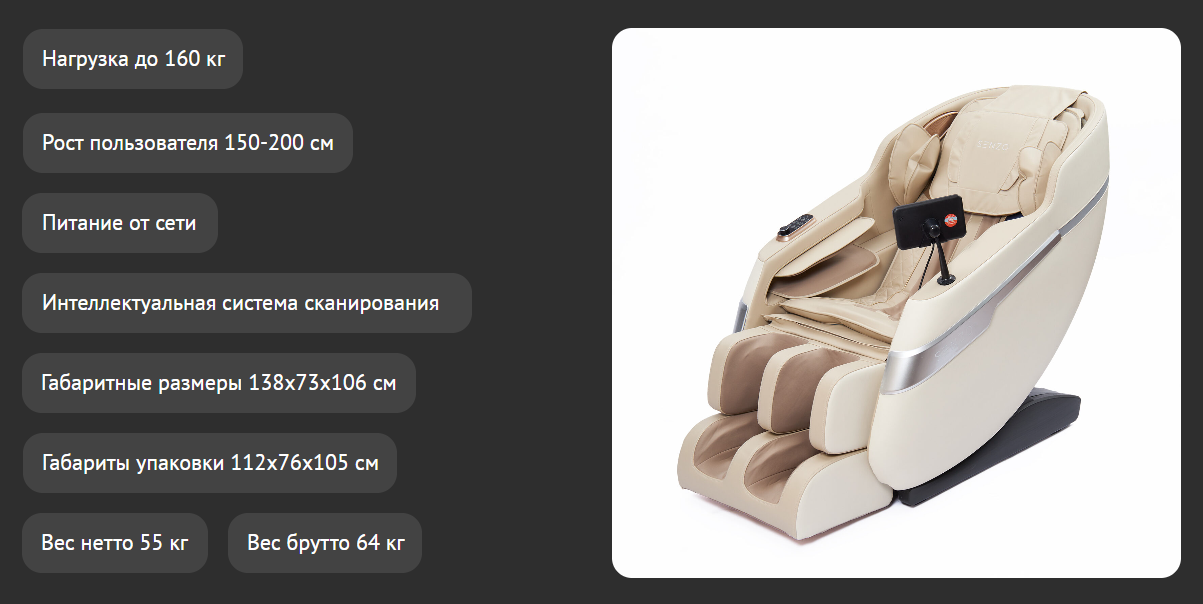 | Зоны массажа | Шея / Спина / Поясница / Плечи / Руки / Бедра / Ягодицы / Икры / Стопы |