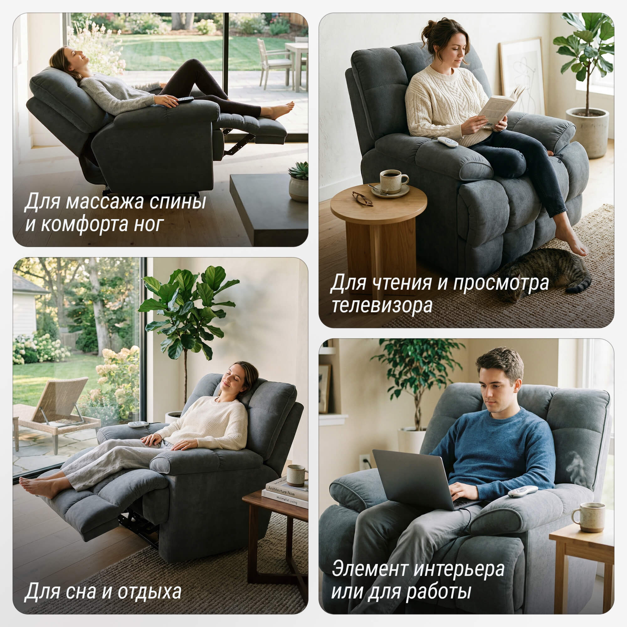 Подставка для ног автоматически поднимается и фиксируется в нужном вам положении до 90°. Спинка плавно откидывается, создавая комфортные условия для полноценного отдыха и сна. Поднятие и опускание элементов регулируется интуитивно понятным пультом управления.