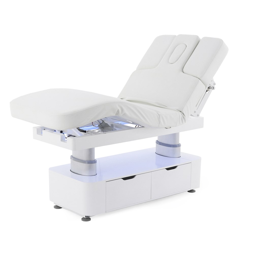 Стол изготовлен с учётом всех потребностей современной индустрии красоты. Мягкое и комфортное ложе имеет несколько секций и 4 мотора для плавной регулировки высоты и угла наклона подвижных частей. Рама изделия выполнена из стали высокой прочности и выдерживает нагрузку до 150 кг, что гарантирует долгий срок службы оборудования.