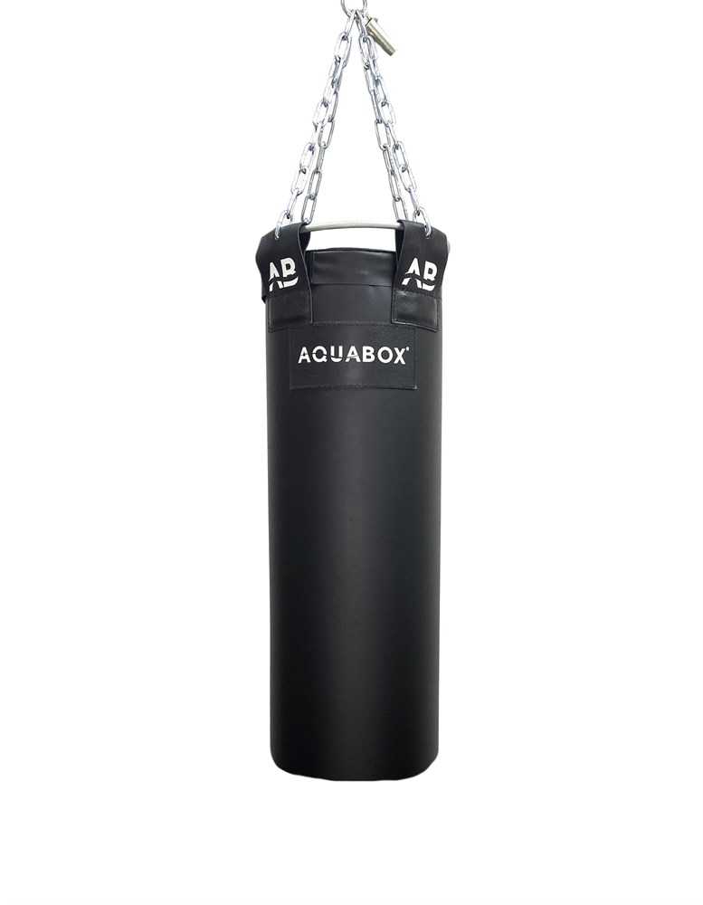 Водоналивной боксерский мешок «AQUABOX». Комбинация свойств воды и воздуха в качестве наполнителя обеспечивает максимальное и комфортное поглощение энергии удара. Внешняя оболочка выполнена из ПВХ ткани. Внутри снаряда расположена колба из армированной газонепроницаемой ПВХ ткани с гидропневмоклапаном, через который заливается вода и достигается нужная жесткость с помощью воздушного насоса. Между наружной оболочкой и внутренней колбой расположен демпфирующий слой из вязкоэластичного ППУ. Все это делает мешок менее травмоопасным. Система подвеса: разъемное стальное кольцо, цепи, карабин.