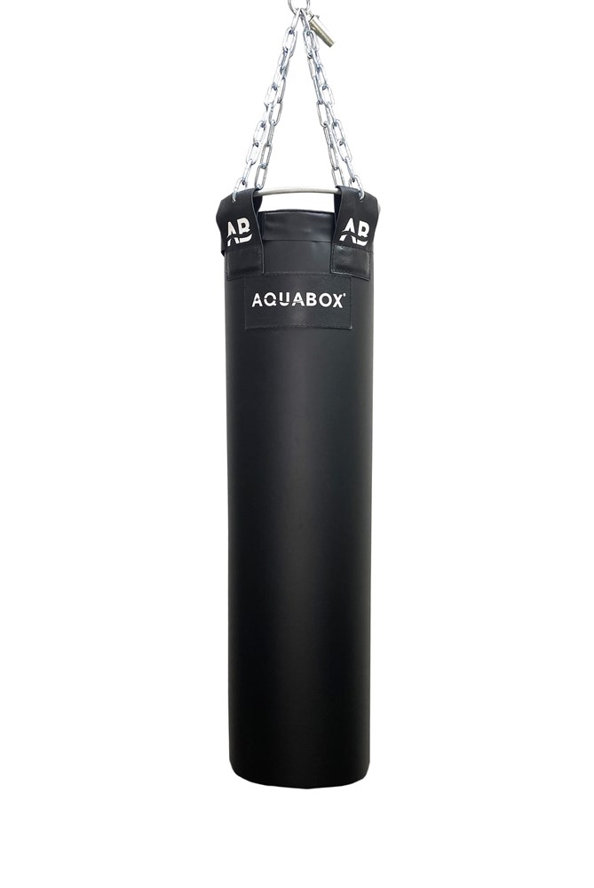 Водоналивной боксерский мешок «AQUABOX». Комбинация свойств воды и воздуха в качестве наполнителя обеспечивает максимальное и комфортное поглощение энергии удара. Внешняя оболочка выполнена из ПВХ ткани. Внутри снаряда расположена колба из армированной газонепроницаемой ПВХ ткани с гидропневмоклапаном, через который заливается вода и достигается нужная жесткость с помощью воздушного насоса. Между наружной оболочкой и внутренней колбой расположен демпфирующий слой из вязкоэластичного ППУ. Все это делает мешок менее травмоопасным. Система подвеса: разъемное стальное кольцо, цепи, карабин.