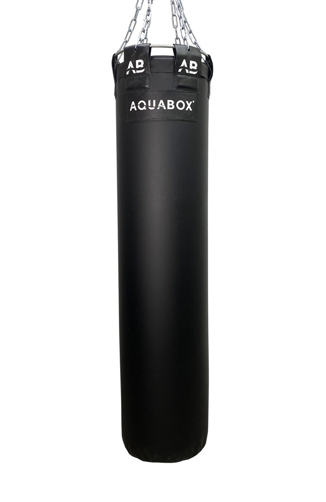 Водоналивной боксерский мешок «AQUABOX». Комбинация свойств воды и воздуха в качестве наполнителя обеспечивает максимальное и комфортное поглощение энергии удара. Внешняя оболочка выполнена из ПВХ ткани. Внутри снаряда расположена колба из армированной газонепроницаемой ПВХ ткани с гидропневмоклапаном, через который заливается вода и достигается нужная жесткость с помощью воздушного насоса. Между наружной оболочкой и внутренней колбой расположен демпфирующий слой из вязкоэластичного ППУ. Все это делает мешок менее травмоопасным. Система подвеса: разъемное стальное кольцо, цепи, карабин.