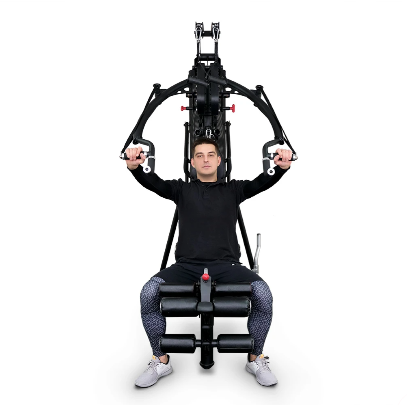 Тренажер выполнен из сверхпрочной стали, оснащен эластичными, прочными тросами, нейлоновыми шкивами, точными шариковыми подшипниками в местах опоры рычагов для тяги.