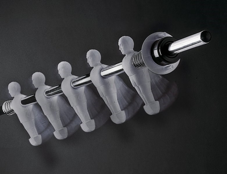 - Одноцветные пластиковые игроки, изготовленные из моплена, представляют собой человеческие фигуры, которые отлиты непосредственно на стержнях. Фигурки игроков остаются неподвижны, так как они крепко держатся на своих «позициях».