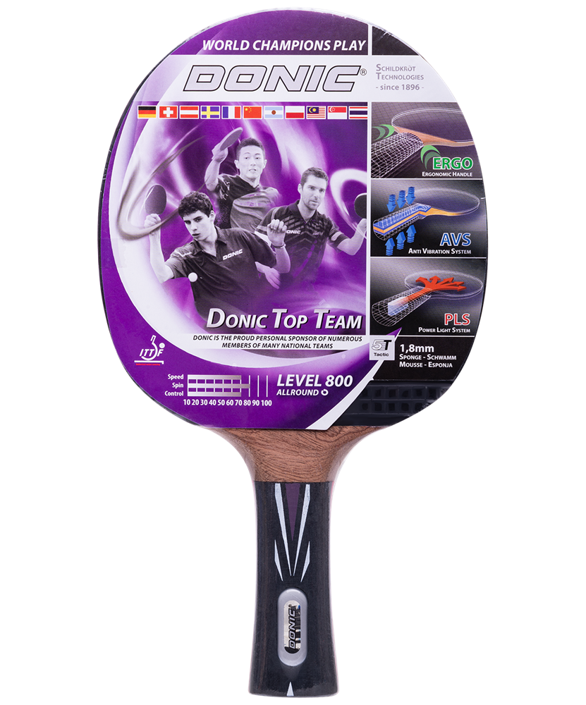 Ракетка для игры в настольный теннис Top Team 800 от всемирно известного немецкого бренда Donic-Schildkröt прекрасно подходит для продвинутых игроков. Коническая форма рукоятки позволяет избежать давления на руку для максимального комфорта в игре. Благодаря технологии AVS (Anti-Vibration-System) достигается улучшенный контроль мяча и снижение вибраций, вызванных ударом мяча, в результате чего повышается точность попаданий. PLS-технология помогает добиться максимальной скорости игры за счет снижения веса рукоятки и смещения центра тяжести к центру головы ракетки для пинг-понга.- Технология Anti-Vibration-System;
