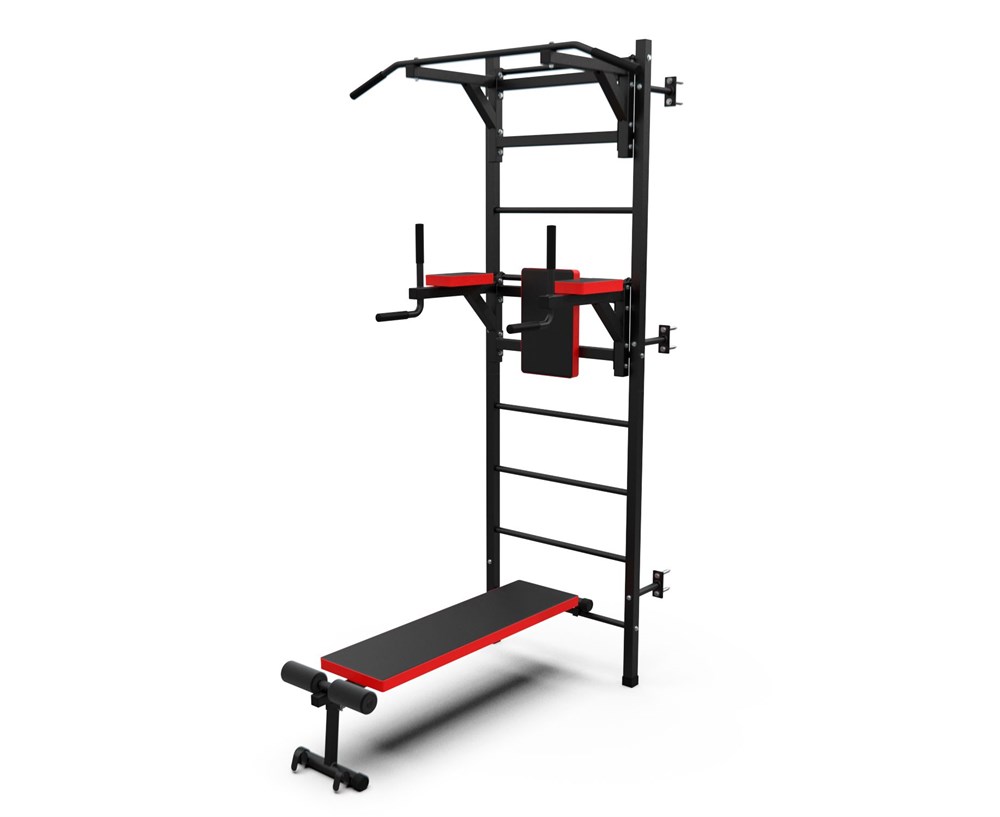 Турник длиной 99 см оснащён мягкими неопреновыми ручками, очень легко перевешивается на перекладины шведской стенки, что позволяет менять его высоту. Расстояние от ручек турника до шведской стенки (вынос турника) - 72 см. Вынос брусьев – 87 см, размер подушки под спину 42 х 25 см, а её толщина 5 см. Подушки подлокотников размерами 25 х 13 х 5 см, а поручни длиной 32 см диаметром 25 мм и толщиной стали 1,5 мм.