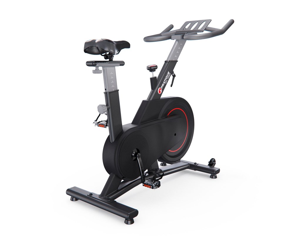 Маховик массой 15 килограмм обеспечивает плавный ход и регулировку интенсивности нагрузки. Возможность крутить педали в обе стороны добавляет разнообразия в тренировочный процесс. Ремень, обернутый вокруг маховика, обеспечивает уровень шума не более 52 дБ, делая спин-байк PRATIQUE идеальным вариантом для домашнего использования.