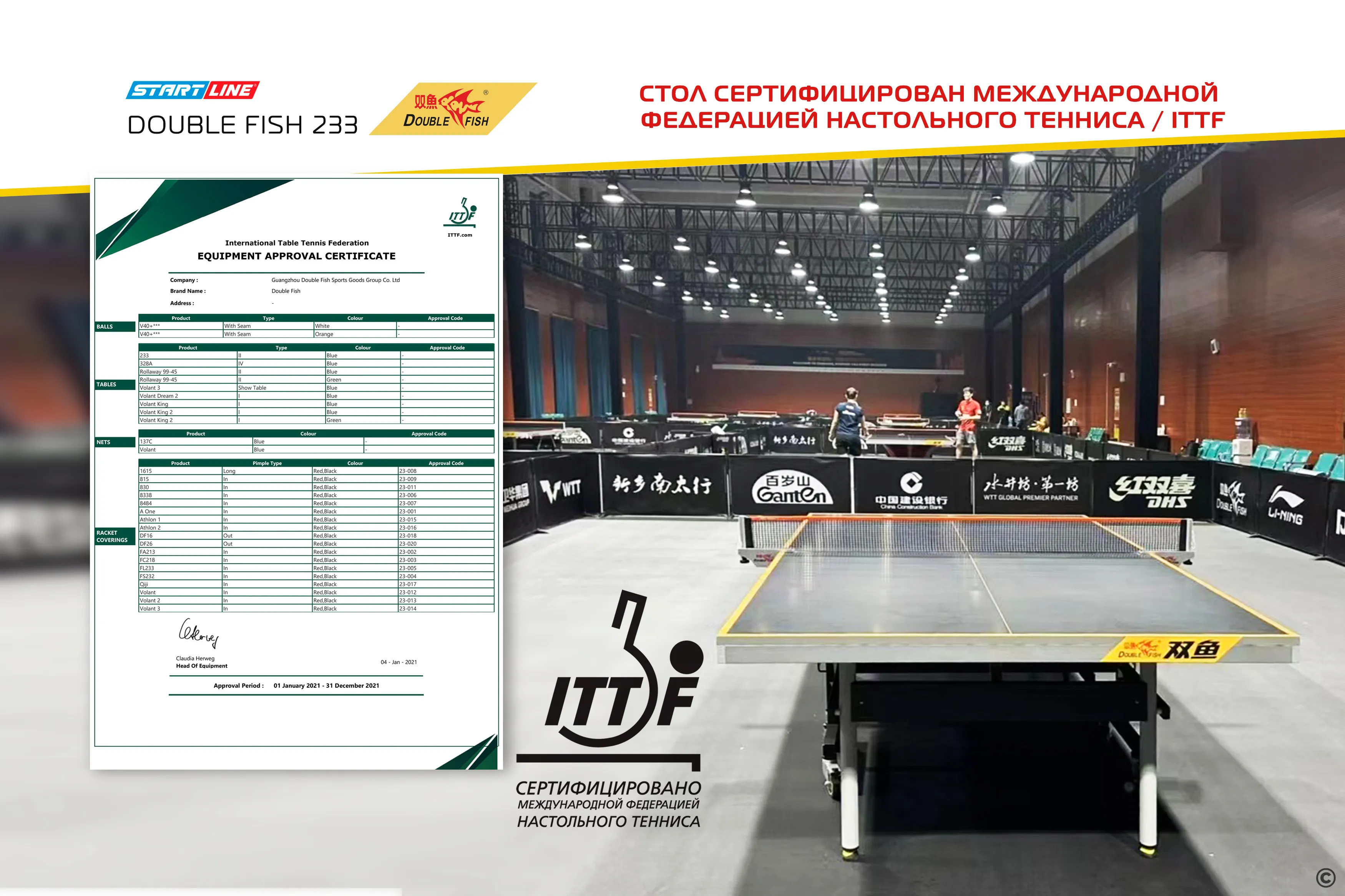 Теннисный стол Double Fish 233 сертифицирован Международной федерацией настольного тенниса (ITTF). Его размеры, параметры и характеристики находятся в строгом соответствии с требованиями ITTF. Уникальной особенностью модели является десятислойная УФ покраска столешницы. Именно так достигается нужное качество игровой поверхности с отскоком в 23,8 см. Многоуровневая покраска также безупречно защищает стол во время турнирного интенсива.