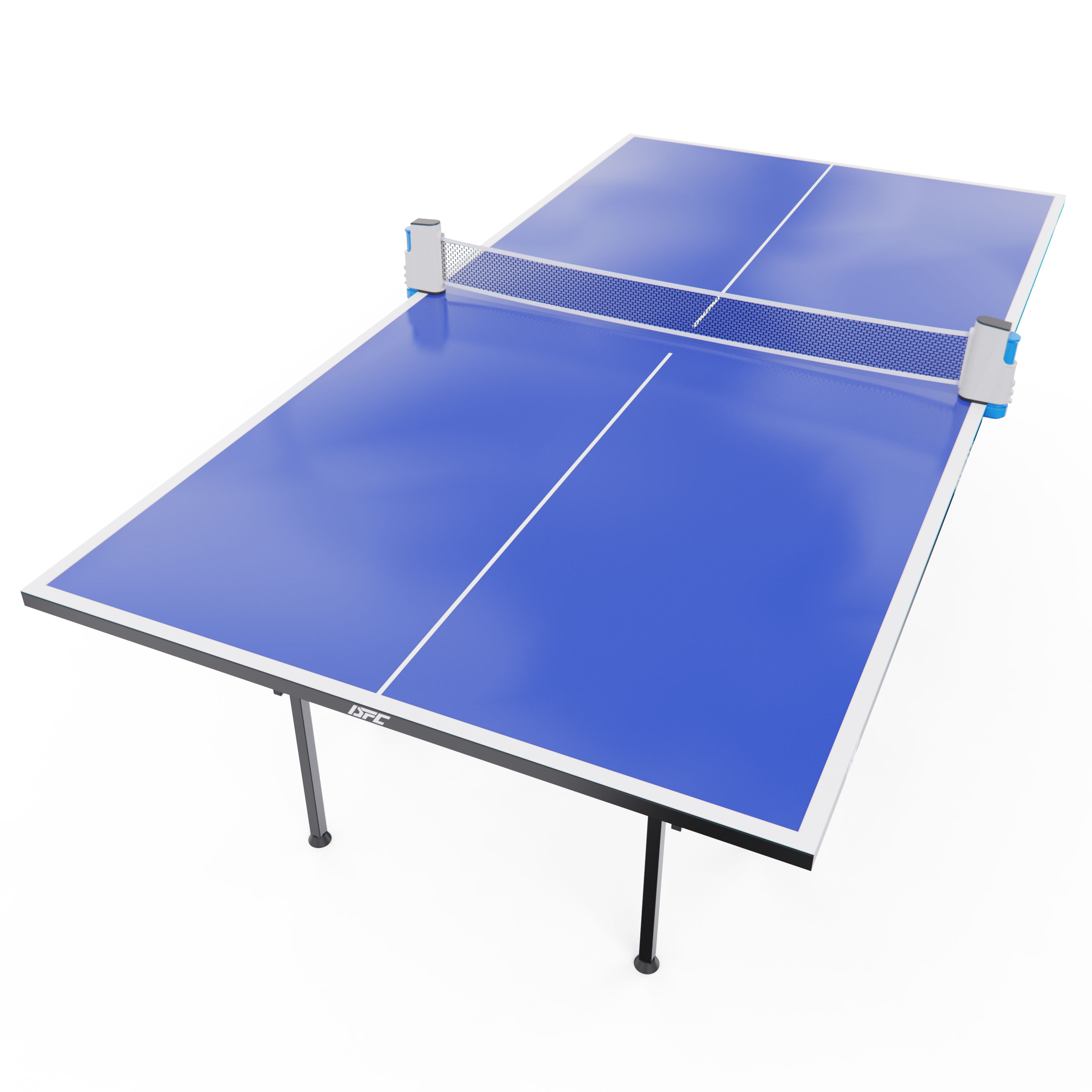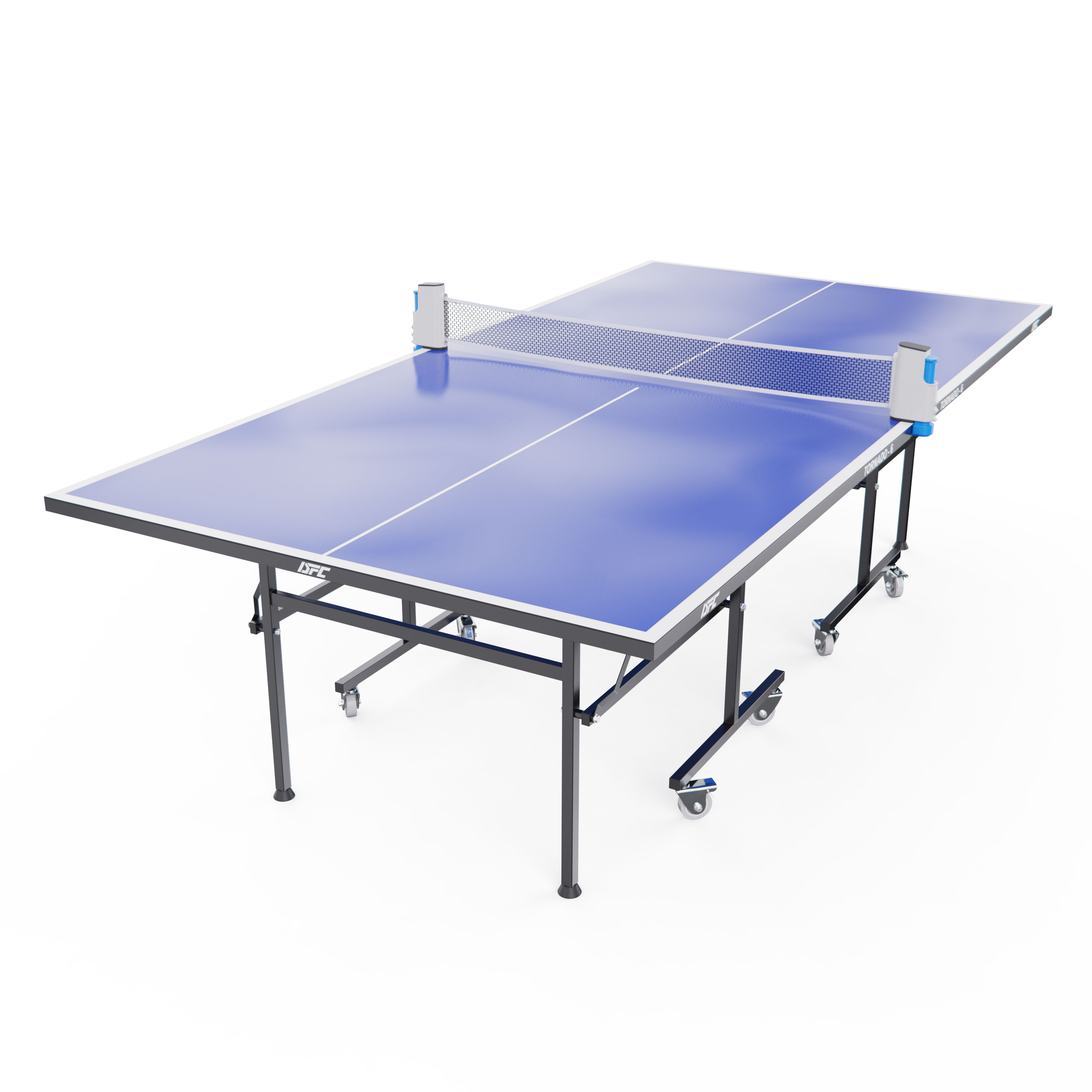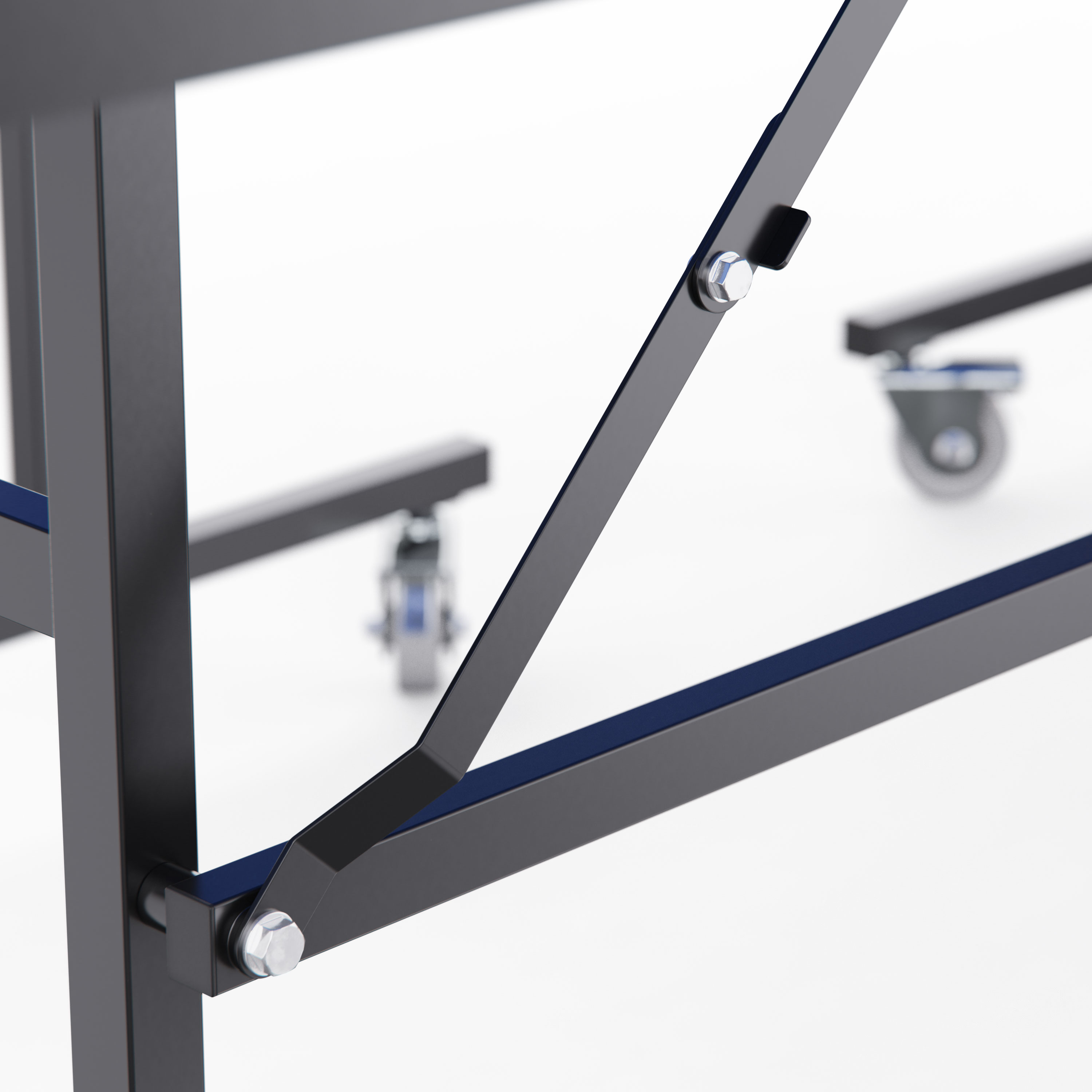 Композитная алюминиевая столешница толщиной 4 мм обеспечивает ровный, стабильный отскок мяча и комфортную игру как для начинающих, так и для опытных игроков. Прочная стальная рама и регулируемые ножки обеспечивают устойчивость даже на неровных поверхностях. Каждая ножка регулируется по высоте до 15 мм, что позволяет точно выровнять стол для идеального игрового положения. Для дополнительной безопасности предусмотрены блокируемые колёса — они надёжно фиксируют конструкцию, предотвращая смещение во время игры.