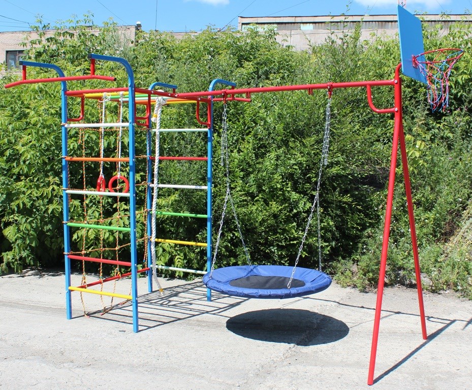 Комплектация ДСКкачели-гнездо, рукоход, кольцо баскетбольное, турник, канат, кольца, сетка для лазания
