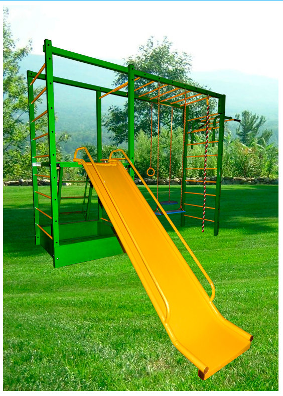 - Комплектация: канат, кольца гимнастические, качели, тарзанка, горка, песочница, турник съёмный (брусья).