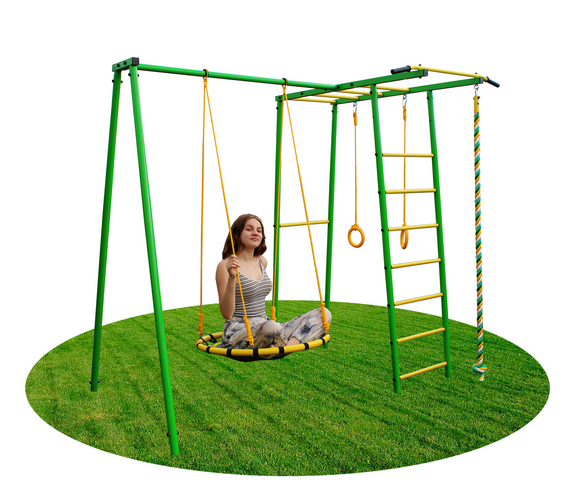 Комплектация: кольца гимнастические, качели-гнездо "Солнышко 80 см", канат, рукоход, шведская стенка.